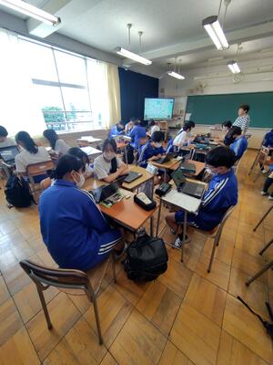クロームブックを活用して1つのシートに全員が書き込めるようにしていました。一人で作業しているようでお互いの記述内容をもとに思い出しながら協働作業を行っていました。