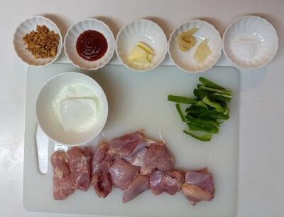 ちなみに、今日、私が準備した材料は、フライドオニオン、ケチャップ、バター、生姜&ニンニク、塩、そして、ヨーグルト、ピーマン、鶏肉です。