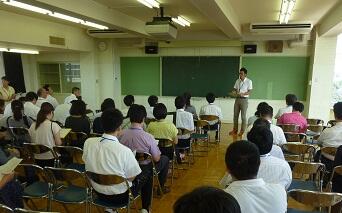 まず初めは特別集会室に集合し、生徒会役員が中学校生活の様子について、資料を使って分かりやすく説明してくれました。