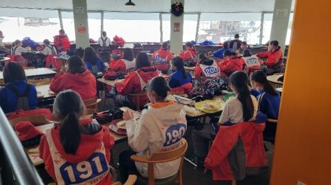 団体専用列車が東京駅を8時42分、定刻どおり出発しました。新幹線での過ごし方は、カードゲームや会話を楽しんだり、車窓の風景を眺めたり、人それぞれです。ゆっくり休んでいる人、読書している人もいます。