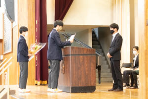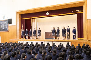 生徒会朝礼が行われ,各専門委員会の委員長へ認証状が渡されました。今後,各委員会や生徒が協力して活動に取り組んでいくこととなります。