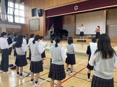 今日の1校時は、全校各クラスで自由曲を選ぶための鑑賞の時間でした。