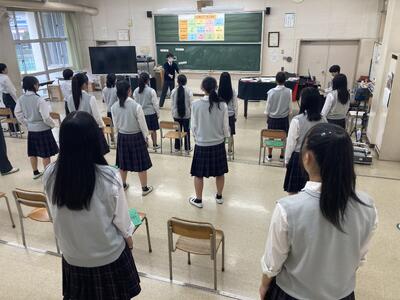 「立川第六中学校の◯◯です。今日からよろしくお願いします。」などの言葉と動きを、ペアでたくさん練習しました。