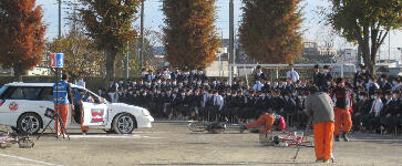スケアード・ストレイト方式による自転車交通安全教室が行わました。全校生徒が校庭でスタントマンによる交通事故の再現を見て、事故の恐ろしさを実感し、交通安全に対する意識を高めました。