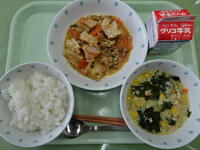 12月15日(月)の給食は、「ハートにんじんDay」として、わかめとたまごのスープには、細切りのにんじんに混ざって、ハート型のにんじんが入っていました。