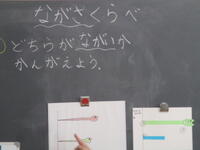 具体的な操作活動を取り入れることで、「長い」「短い」「端をそろえて」等の長さを表す言葉がたくさん子どもたちから出ていました。