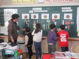 3年生の外国語活動の学習は、「3ヒントクイズ」に取り組んでいました。「vegetable、orange、triangle」などと英語でヒントを出し、相手に「carrot」と正解を考えてもらう活動です。とても楽しそうに、また意欲的に活動していました。