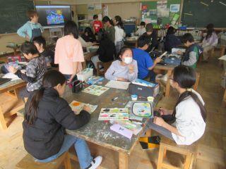 4年生は総合的な学習の時間で、自分たちで調べたことや考えたことを模造紙にまとめていました。友達と協力し合って作業を進めていました。