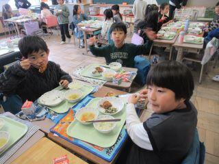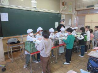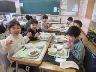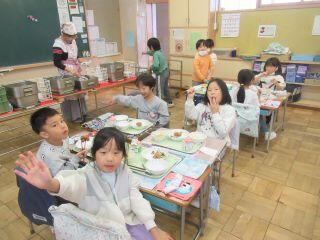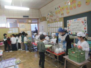 続いて1〜3年生の給食の様子です。1年生も、給食当番の仕事をとても上手にしていました。3年生の教室では、力のこもった「おかわりじゃんけん」の様子が見られました。