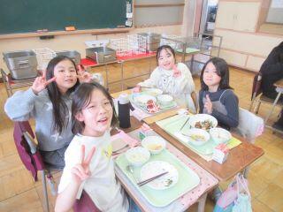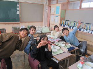 次は、みんなで協力し合っている給食の配膳の様子と班の友達と楽しく食事をしている様子です。(4年生と5年生)