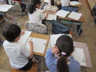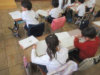 最後は1年生の国語の授業の様子です。原稿用紙を使って、作文を書いていました。入学してから一文字ずつ平仮名を覚えていた1年生が、1年間でこんなに成長したのかと感動してしまいました!