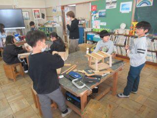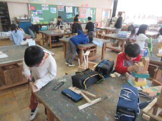 続いて3年生の図工の授業の様子です。木材を使った思い思いのタワーができあがってきました。