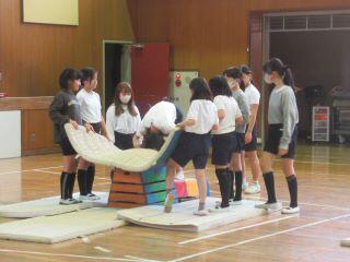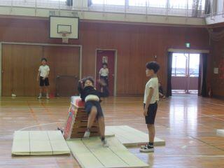 5年生は体育館で跳び箱の学習をしていました。個々のめあてに沿って、台上前転や首はね跳びの練習を友達と助け合いながら行っていました。