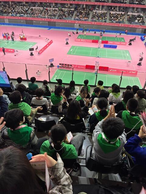 今日、5年生はデフリンピックの観戦です。バドミントンを見ます。エールの仕方を教わり、早速やっています。