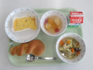 ニギスの唐揚げ、人参しりしり、豚肉と白菜の煮物、ご飯、牛乳