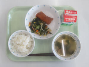 さわらの塩麹焼き、ほうれん草とコーンの炒め物、ジャガイモとニラの味噌汁、ご飯、牛乳