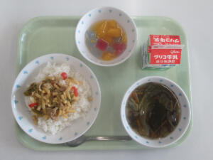 今日は、ワカメについてお話します。ワカメは、生で味わえるほか、乾燥して保存もできます。そのため、一年中食べられます。ワカメや昆布を水につけるとヌルヌルしたものが出てきます。これは食物繊維です。食物繊維には、お腹をスッキリさせてくれる働きがあります。さらにワカメには、カルシウムもたっぷり含まれています。柔らかい部分は、味噌汁やサラダ、茎の部分は、炒め物にすると美味しく食べられます。今日の給食は、柔らかい部分を使った「カブとワカメの味噌汁」です。