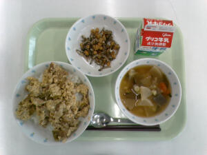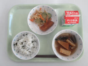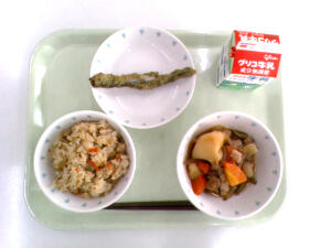 鶏ごぼうご飯、ししゃもの磯辺揚げ、肉じゃが、牛乳