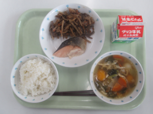 今日は「和食の日」についてお話します。11月24日は、「和食の日」です。和食は、2013年に、ユネスコ無形文化遺産に登録されました。4つの特徴のうち、今日は2つを紹介します。1つ目は、日本は海・山・里など表情豊かな自然が広がっているため、各地で地域に根ざした食材が使われているということです。2つ目は、和食は一汁三菜を基本とする食事スタイルで、旨味を上手に使うことによって動物性油脂の少ない、栄養バランスの良い食事であるということです。今日は、和食の特徴を活かし、鰹節の出汁をとって作った「千草焼き」と、山形県の郷土料理である「芋煮」を作りました。和食についてもっと知りたい人は、給食だよりに載せているので見てください。