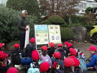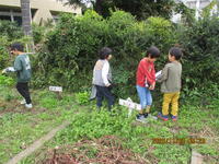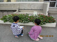 1年生が校庭や花壇で何かを探していました。虫や植物、木の根本に空いた不思議な穴、、、見つけたものをみんなに説明する国語科「なにに 見えるかな」の授業風景です。