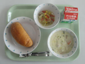 今日は、「図書給食の日」です。紹介する図書は、「かぼちゃスープ」です。あらすじを紹介します。ある所に、ネコとリスとアヒルが仲良く暮らしていました。3匹が、それぞれ決まった役目で毎日作るかぼちゃスープは世界一美味しいスープ。ところがある日、アヒルが「ぼくがスープをかきまぜる!」と言い始め、3匹は大げんか。美味しいスープはどうなるの。今日の給食は、3匹が作ったかぼちゃスープにちなんだ「かぼちゃのポタージュ」です。絵本に出てくる世界一美味しいスープに負けない味に出来上がりました。「ブロポテサラダ」は、昨年度の立川第四中学校の3年生が立川産のブロッコリーについて学習した時に考えてくれたレシピです。今日のブロッコリーは立川産で、立川農業振興会から無償で提供していただきました。今が旬の立川産のブロッコリーを味わってください。