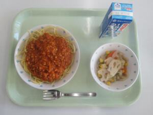スパゲティミートソース、れんコーンサラダ、飲むヨーグルト