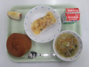 今日は「りんご」についてお話します。みなさんは、りんごがどのようにして育つか知っていますか。日本で最もりんごが多くとれる青森県では、雪が溶けた4月頃から作業が始まります。肥料をまき、花が咲いたら授粉をします。5月頃から9月頃の収穫までの間は、大きくきれいな実を育てるために、不要な花や実を選んで摘んだり、袋をかけたりします。さらに、きれいな赤色になるように、気温が低くなってきたら袋を外し、実を太陽に当てます。このように長い間大切に育てた果実がようやく収穫を迎えるのです。今日のりんごはもちろん、皆さんの食べている食べ物は、農業者の方が心を込めて育てたものです。感謝して食べる気持ちを忘れないようにしましょう。また、今日は、ハートにんじんデーです。「白菜とベーコンのスープ」にハートにんじんが入っていますので、探してみてください。
