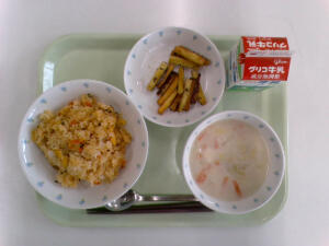 キムチ卵チャーハン、スティック大学いも、豆乳中華スープ、牛乳