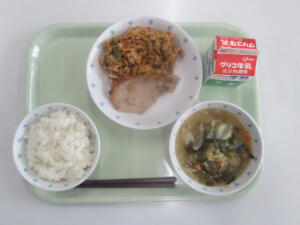 豚肉の照り焼き、千切り大根の煮付け、キャベツとニラの味噌汁、ご飯、牛乳