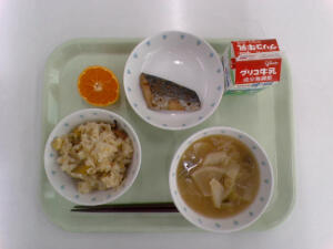 秋の香りご飯、さわらのごま味噌焼き、白菜と大根の味噌汁、みかん、牛乳