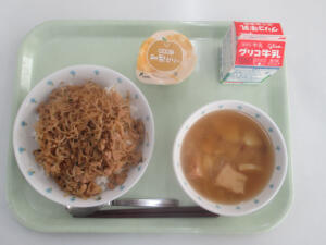 今日は、リクエスト給食です。第二小学校の6年1組がリクエストしてくれたのは、「ひき肉としらたきのピリ辛丼」です。ニンニクや生姜を油で熱し、いい香りがしてきたところに、豚ひき肉を入れて炒め、しらたきを加えて、ピリッと甘辛く味付けしました。しらたきをジャガイモや大根に変えても美味しくできます。今日は、具材をご飯にかけて食べてください。