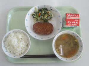 ぎょろっけ、白菜と小松菜のからし和え、スタミナ味噌汁、牛乳
