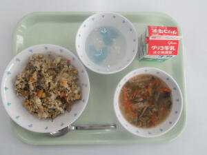 きのこご飯、五目卵焼き、豆豚汁、牛乳