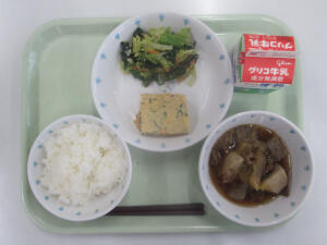 千草焼き、小松菜とキャベツの胡麻和え、芋煮、ご飯、牛乳