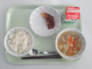 今日は、給食目標のお話をします。今月の給食目標は、「感謝の気持ちをもって食べよう」です。食べ物を食べるということは、植物や動物の命をいただくということです。食事をするときに、「いただきます」と挨拶をするのは、命をいただくことへの感謝の気持ちを表します。また、食べ物を育てる生産者の皆さん、食品の加工や販売に関わる人、レシピを考え、調理をする人、調理したものを運ぶ人など、たくさんの人によって成り立っています。食事の終わりに「ごちそうさま」と挨拶をするのは、このように食事を作ることに関係している、すべての人への感謝の気持ちを表します。日々の食事に感謝を忘れずに、大切にいただきましょう。
