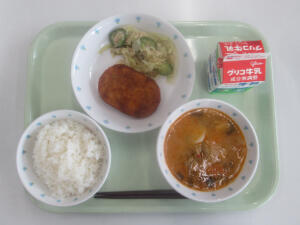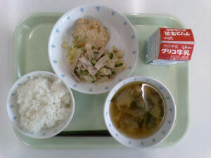 今日の給食は、「豆乳味噌汁」です。豆乳は、大豆を水に浸してすりつぶし、煮詰めたものを濾した液状のものです。豆乳と味噌が同じ大豆からできているからでしょうか、豆乳と味噌は、とても相性が良いです。豆乳を味噌汁に入れるとまろやかで優しい味になります。そして、不足しがちな豆・豆製品を摂取することができます。今日の「豆乳味噌汁」が気に入ったら、ぜひ、お家でも試してみてください。