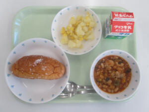 チキンカツ(ソース)、こふきいも、ミルクパン、豆のスープ、牛乳