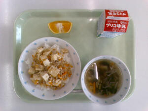 麻婆丼、茎わかめ入り中華スープ、バレンシアオレンジ、牛乳