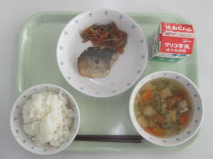 鯖のねぎ味噌焼き、ごぼうの炒め物、あられ汁、ご飯、牛乳