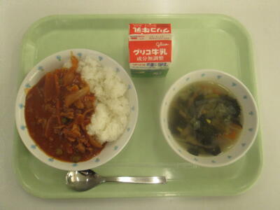 ハヤシライス、ほうれん草のコーンのスープ、牛乳