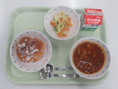 今日は、「マラサダ」と「グヤーシュ」についてお話します。皆さんは、2つの料理がどの国が発祥の料理か知っていますか。答えを言ってしまうと、「マラサダ」はポルトガル、「グヤーシュ」はハンガリーです。ちなみにポルトガルもハンガリーもヨーロッパの国です。「マラサダ」は、イースト菌という菌を使って発酵させた生地を、丸くして油で揚げて、粉砂糖やシナモンをまぶした揚げ菓子です。給食では、丸いパンを油で揚げて砂糖をまぶしました。また、「グヤーシュ」は、家庭料理で、赤パプリカを使うのが特徴の煮込み料理です。言葉だけではどのような料理かイメージしにくいと思うので、実際に食べて味わってください。