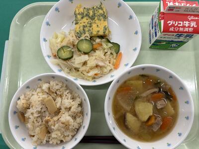 たけのこごはん、しらすいりたまごやき、きりぼしだいこんのサラダ、さつまじる
