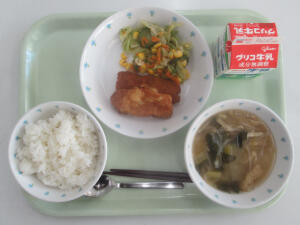ちくわのニコニコ揚げ、ブロッコリーとコーンのサラダ、もやしと油揚げの味噌汁、ご飯、牛乳