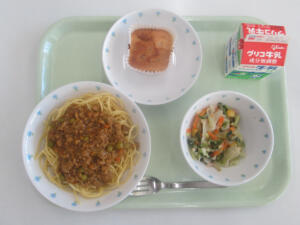 スパゲッティカレーソース、キャベツナサラダ、りんごのケーキ、牛乳