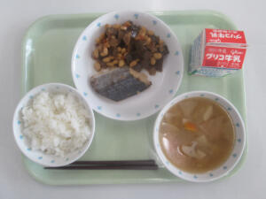 さわらの味噌煮、五目煮豆、いものこ汁、ご飯、牛乳
