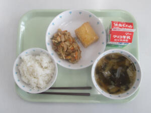 擬製豆腐、千切り野菜炒め、カブとワカメの味噌汁、ご飯、牛乳