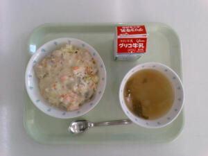 今日は、ワカメについてお話します。ワカメは、生で味わえるほか、乾燥して保存もできます。そのため、一年中食べられます。ワカメや昆布を水につけるとヌルヌルしたものが出てきます。これは食物繊維です。食物繊維には、お腹をスッキリさせてくれる働きがあります。さらにワカメには、カルシウムもたっぷり含まれています。柔らかい部分は、味噌汁やサラダ、茎の部分は、炒め物にすると美味しく食べられます。今日の給食は、柔らかい部分を使った「カブとワカメの味噌汁」です。