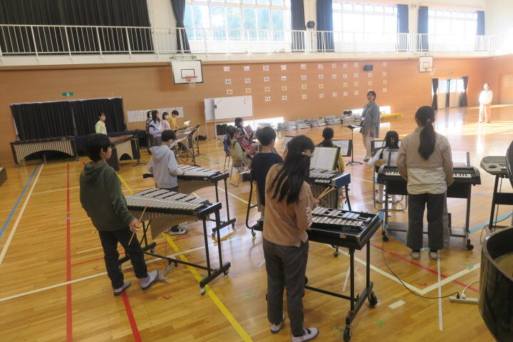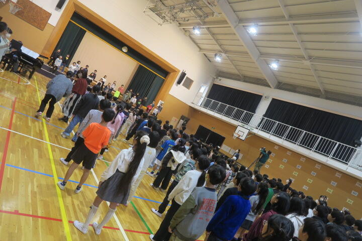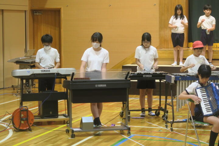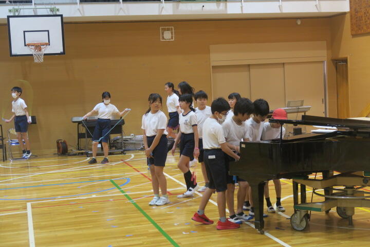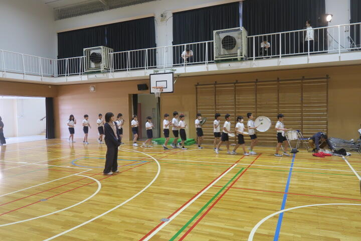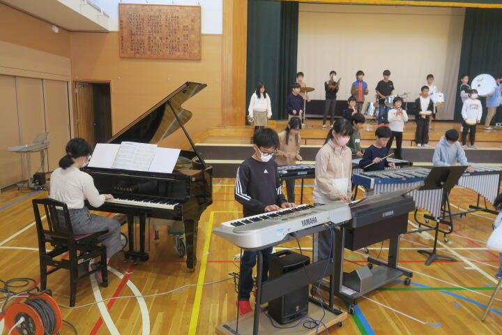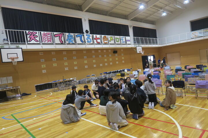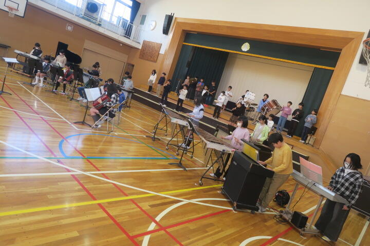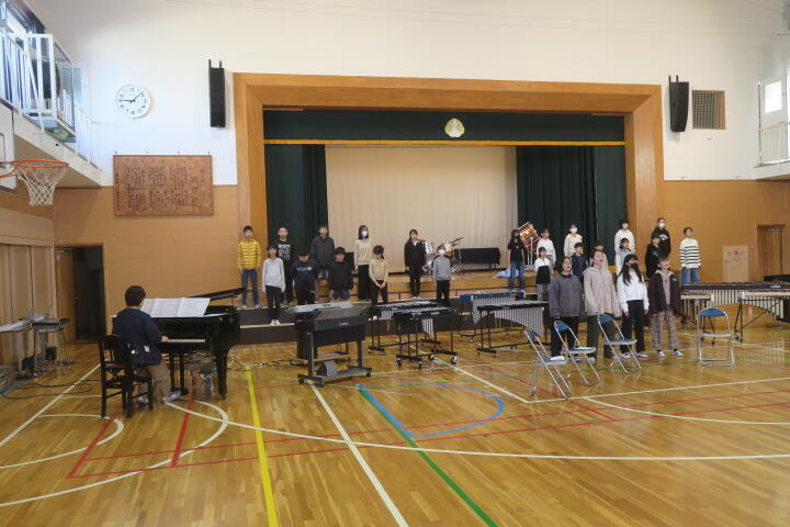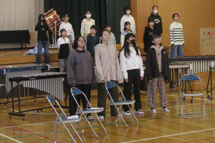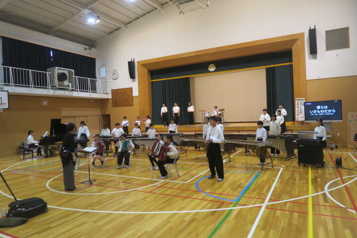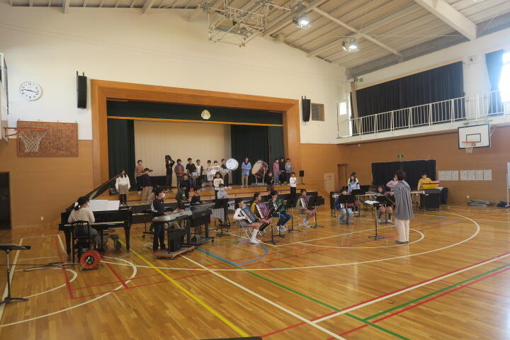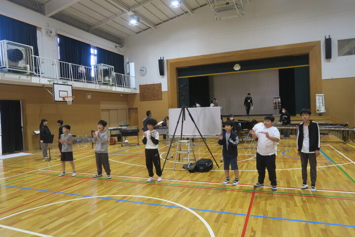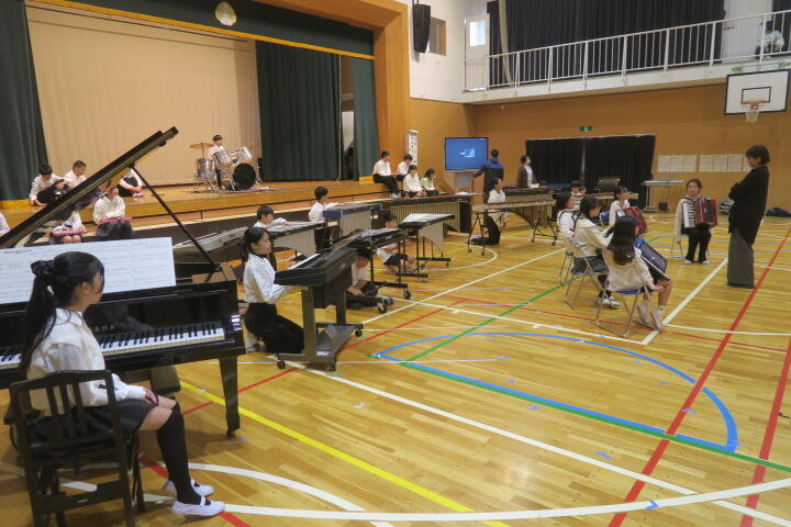 体育館で合奏と合唱の練習を本番通りに行っていました。