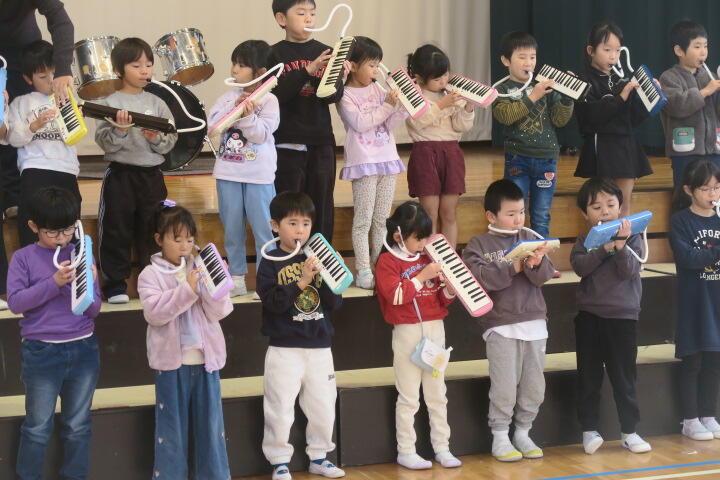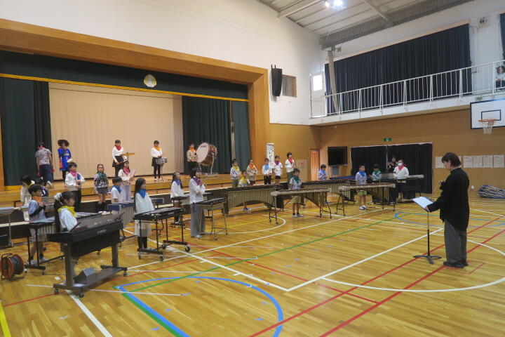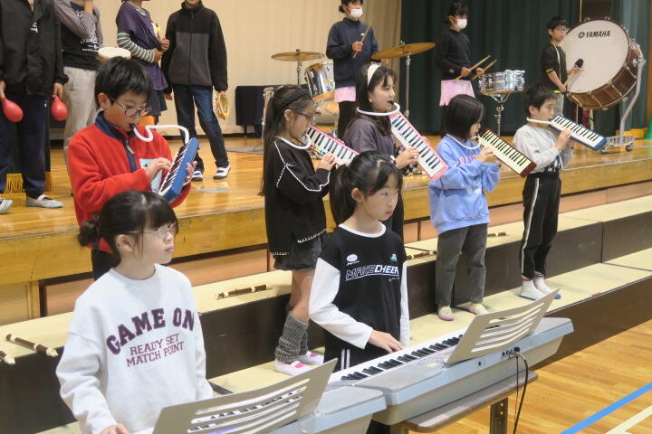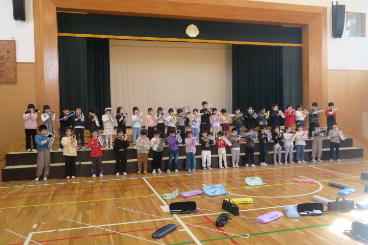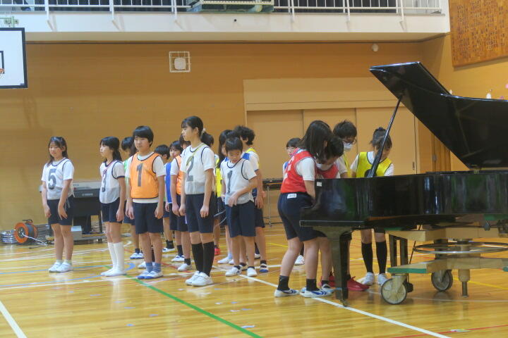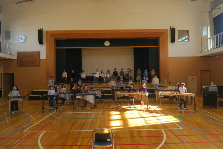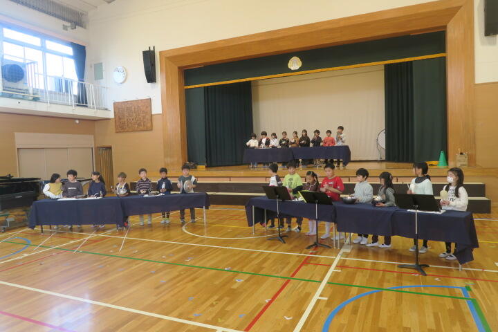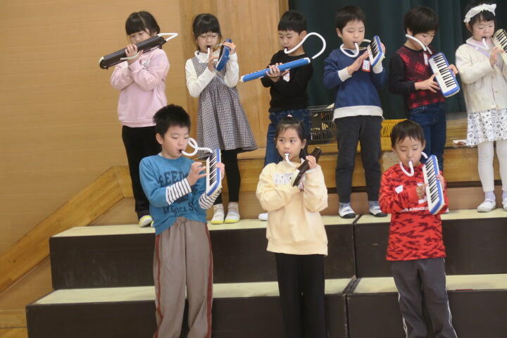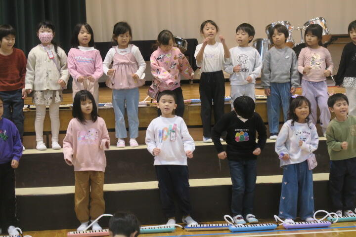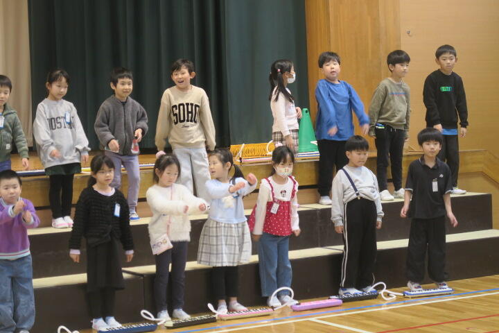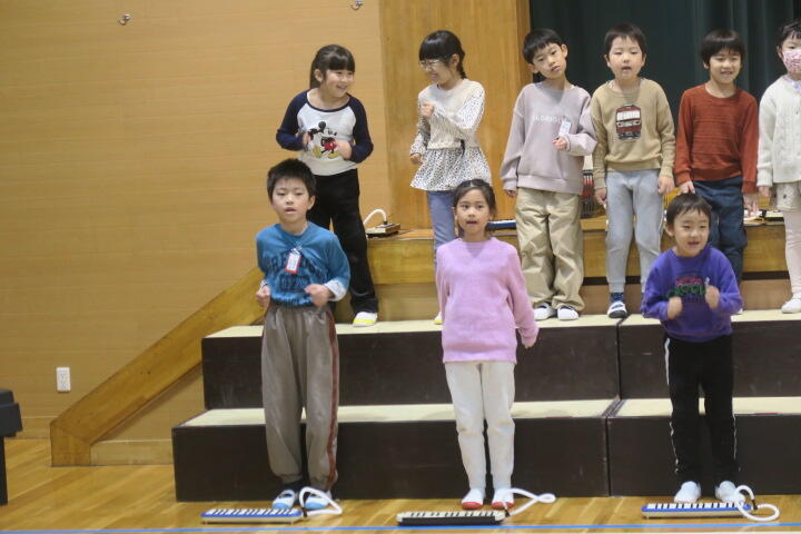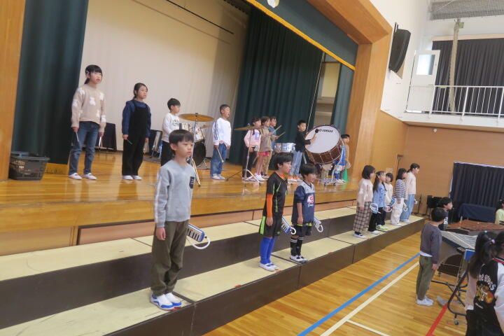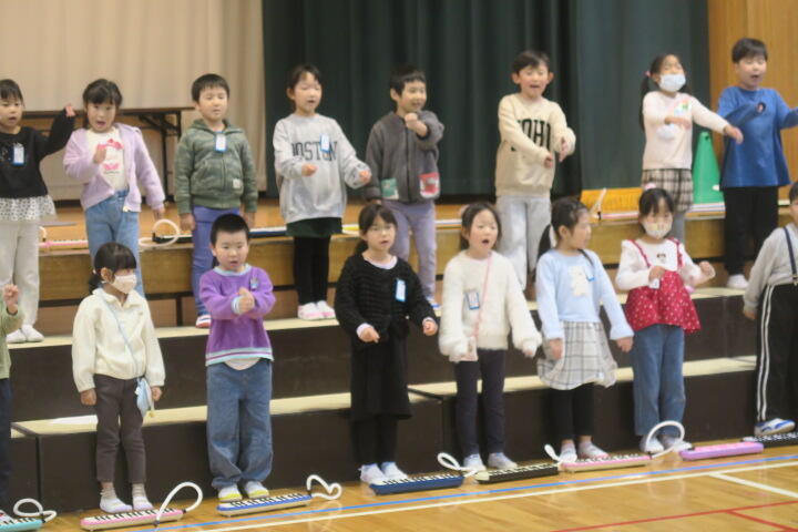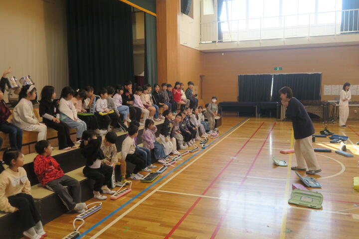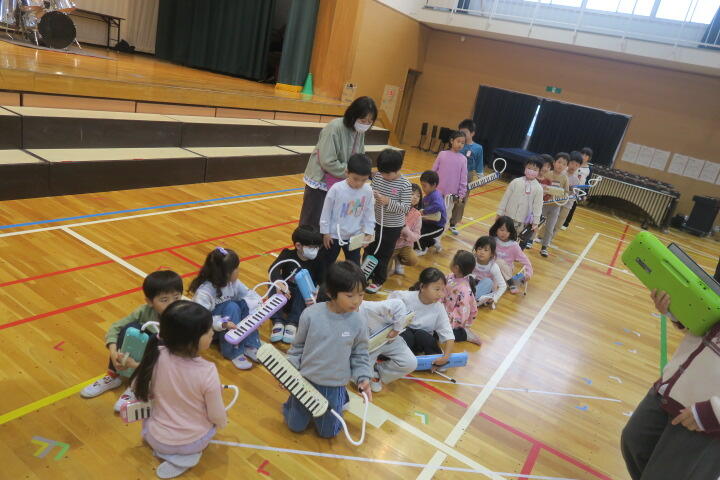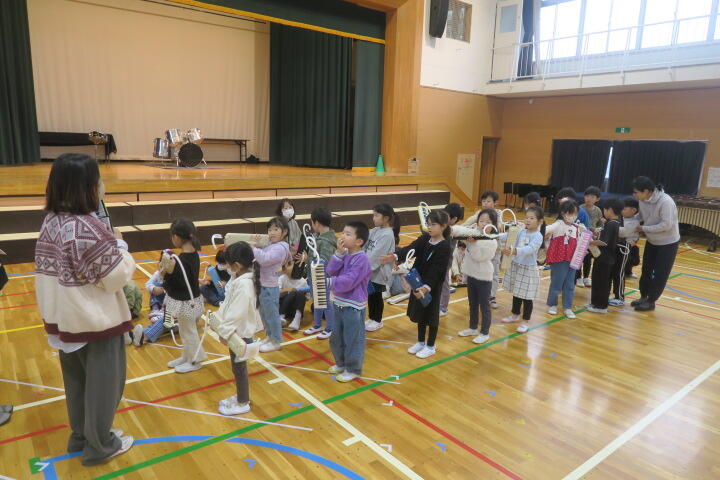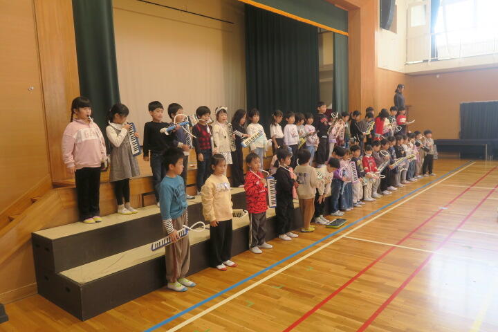 体育館で鍵盤ハーモニカの演奏をしているところでした。