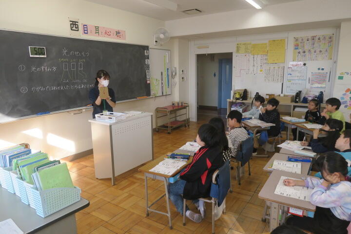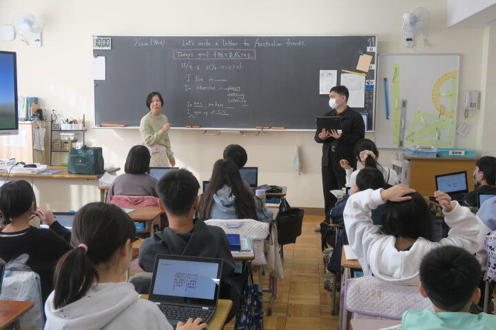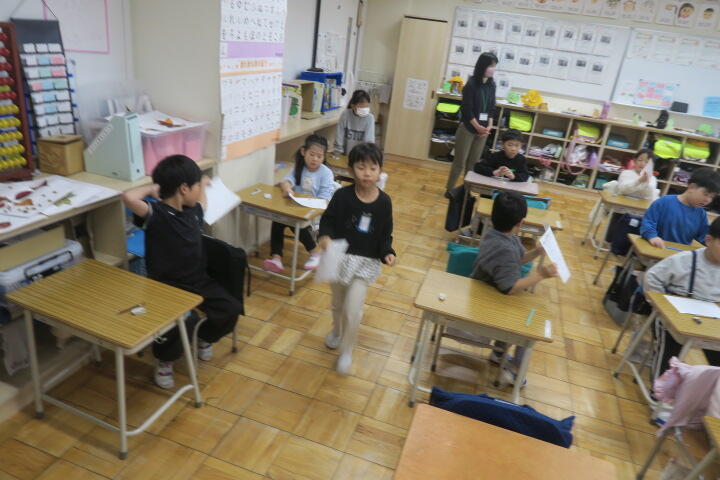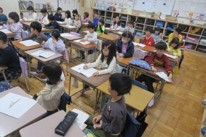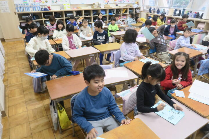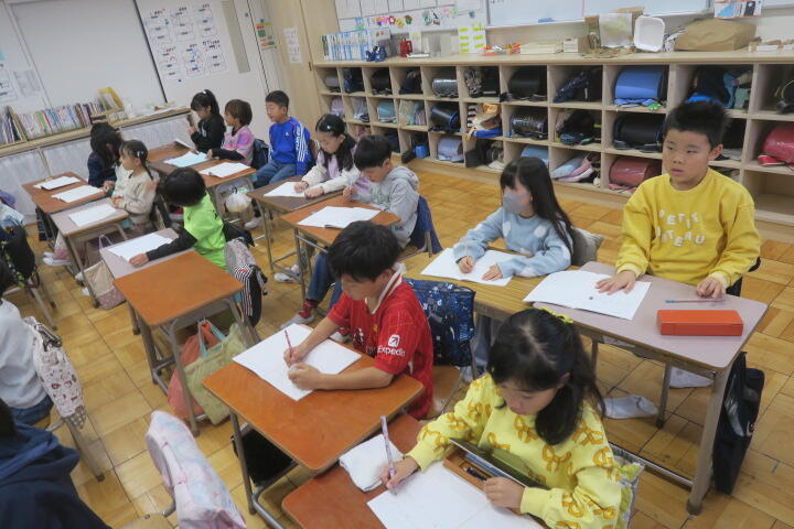 4年生の外国語活動は自己紹介カードを書く学習です。